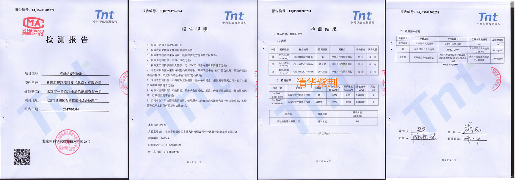 我公司承接的北京市環衛集團下屬一清百瑪士綠色能源有限公司除臭項目,經過為期一個半月的設備改造,我公司投入科研力量、資金、人力,對項目重新進行了各方面的評估,增加工藝環節、對現有設備進行改造,并安排專門人員進行系統調整和狀態監控,按期完成改造工作并委托第三方檢測機構進行了項目檢測驗收。